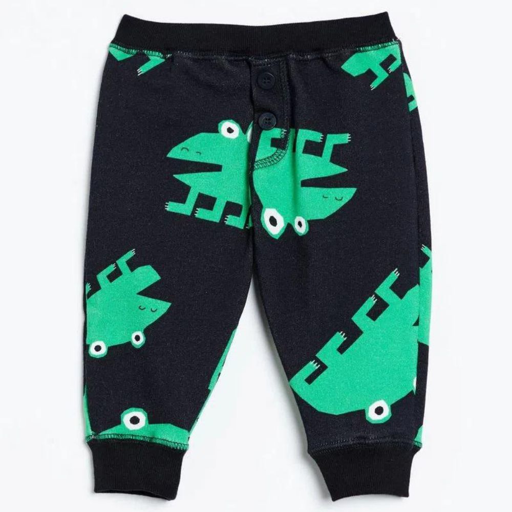 • Possui fecho com 2 botões na parte da frente, elástico que ajusta na cintura, ribana nos tornozelos e estampa de jacarés engraçados espalhados por toda a calça;